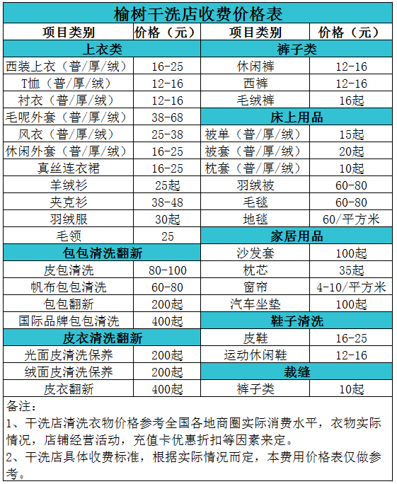 榆樹干洗店收費價格表【詳細收費標準】怎么收費更賺錢