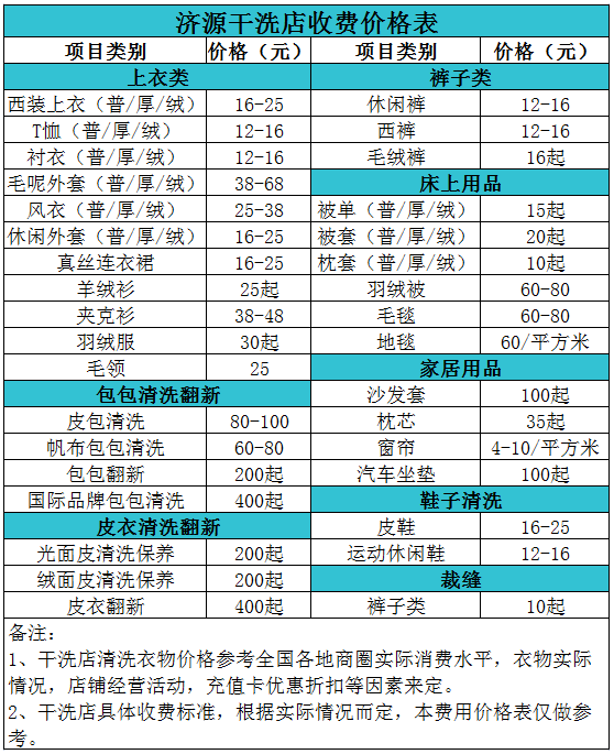 濟源干洗店收費價格表【詳細收費標準】怎么收費更賺錢