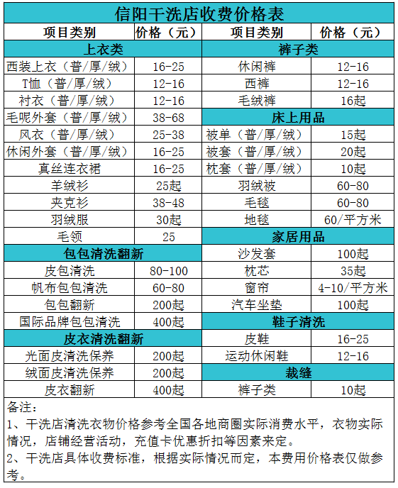 信陽干洗店收費價格表【詳細收費標準】怎么收費更賺錢