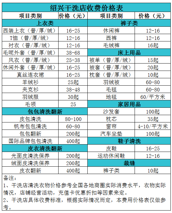 紹興干洗店收費價格表【詳細收費標準】怎么收費更賺錢
