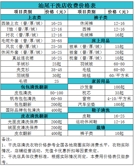 汕尾干洗店收費價格表【詳細收費標準】怎么收費更賺錢