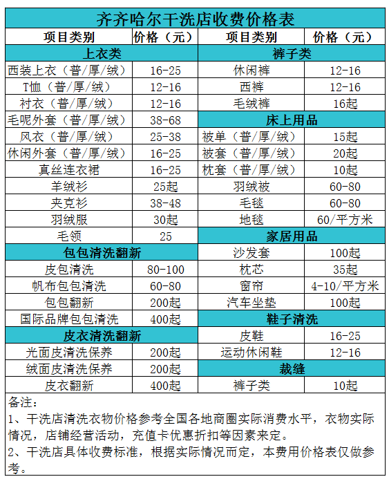 齊齊哈爾干洗店收費價格表【詳細收費標準】怎么收費更賺錢